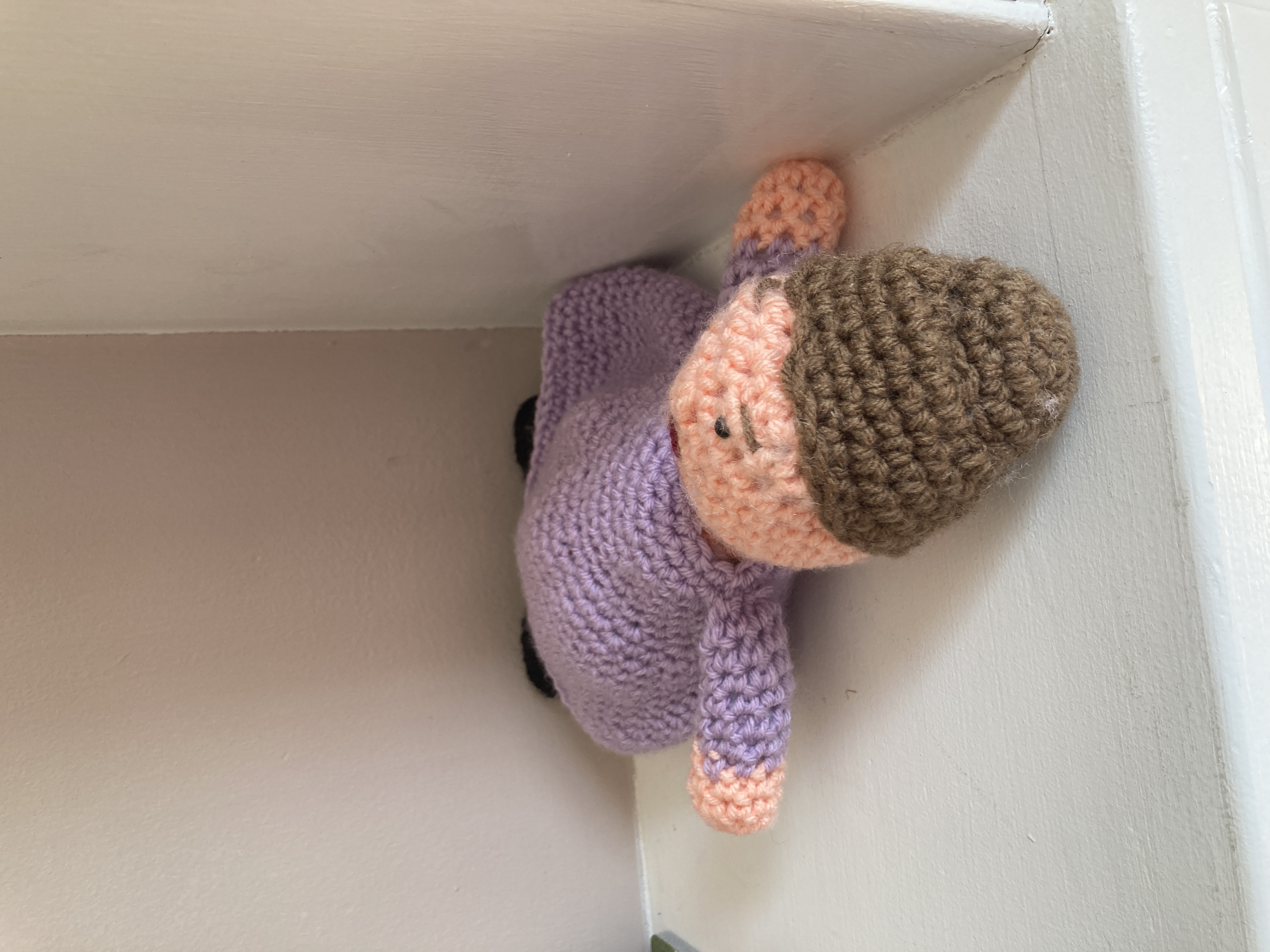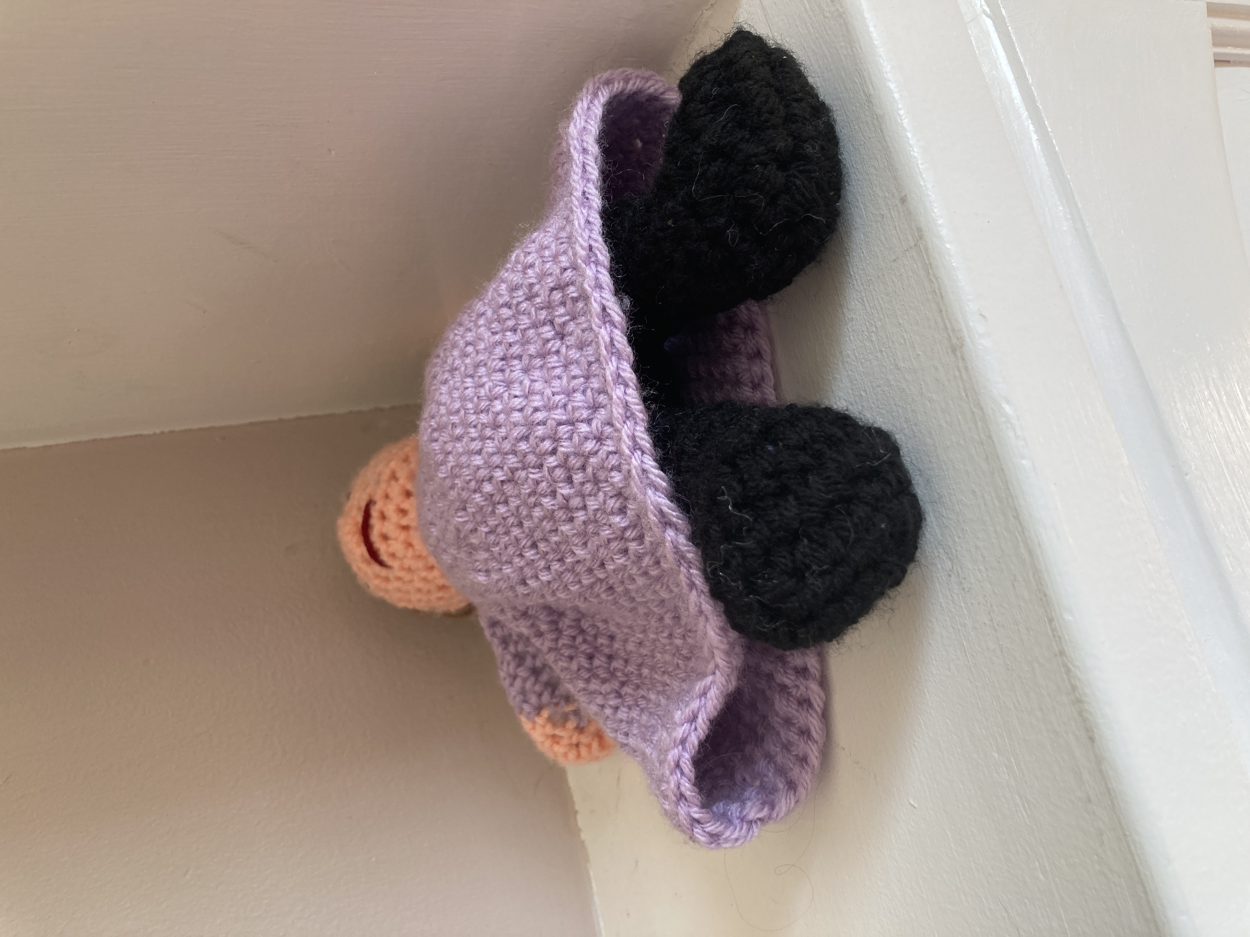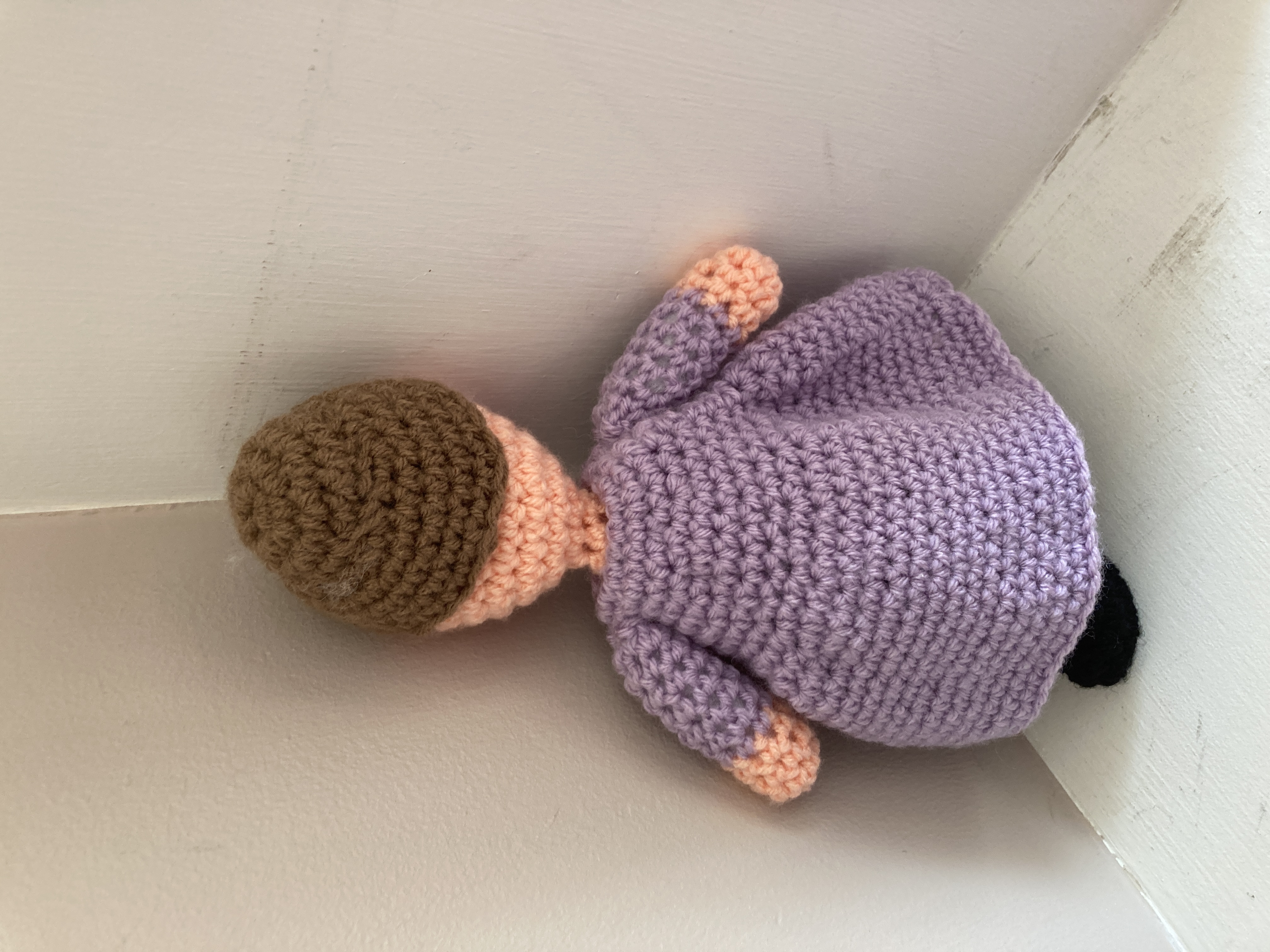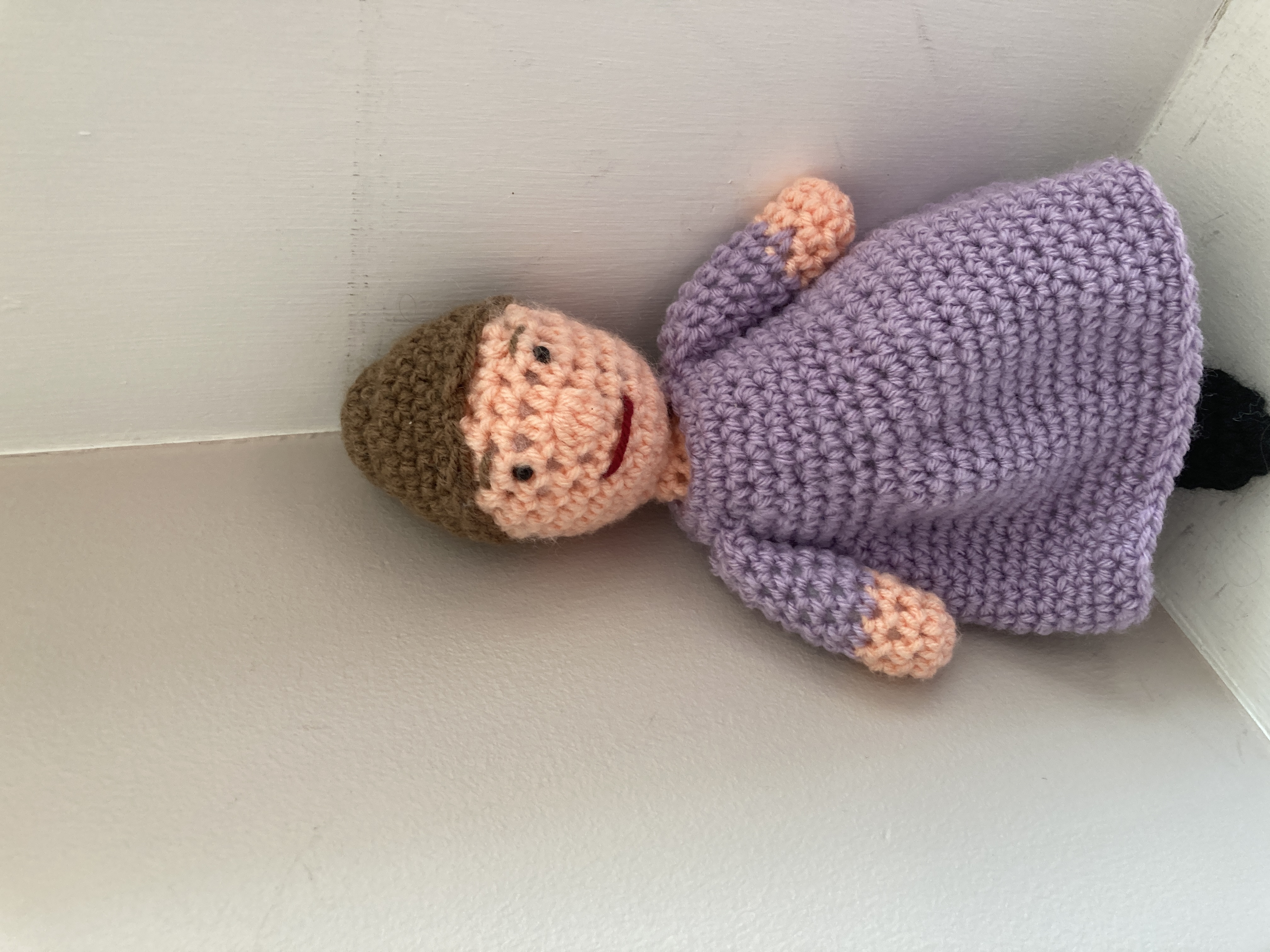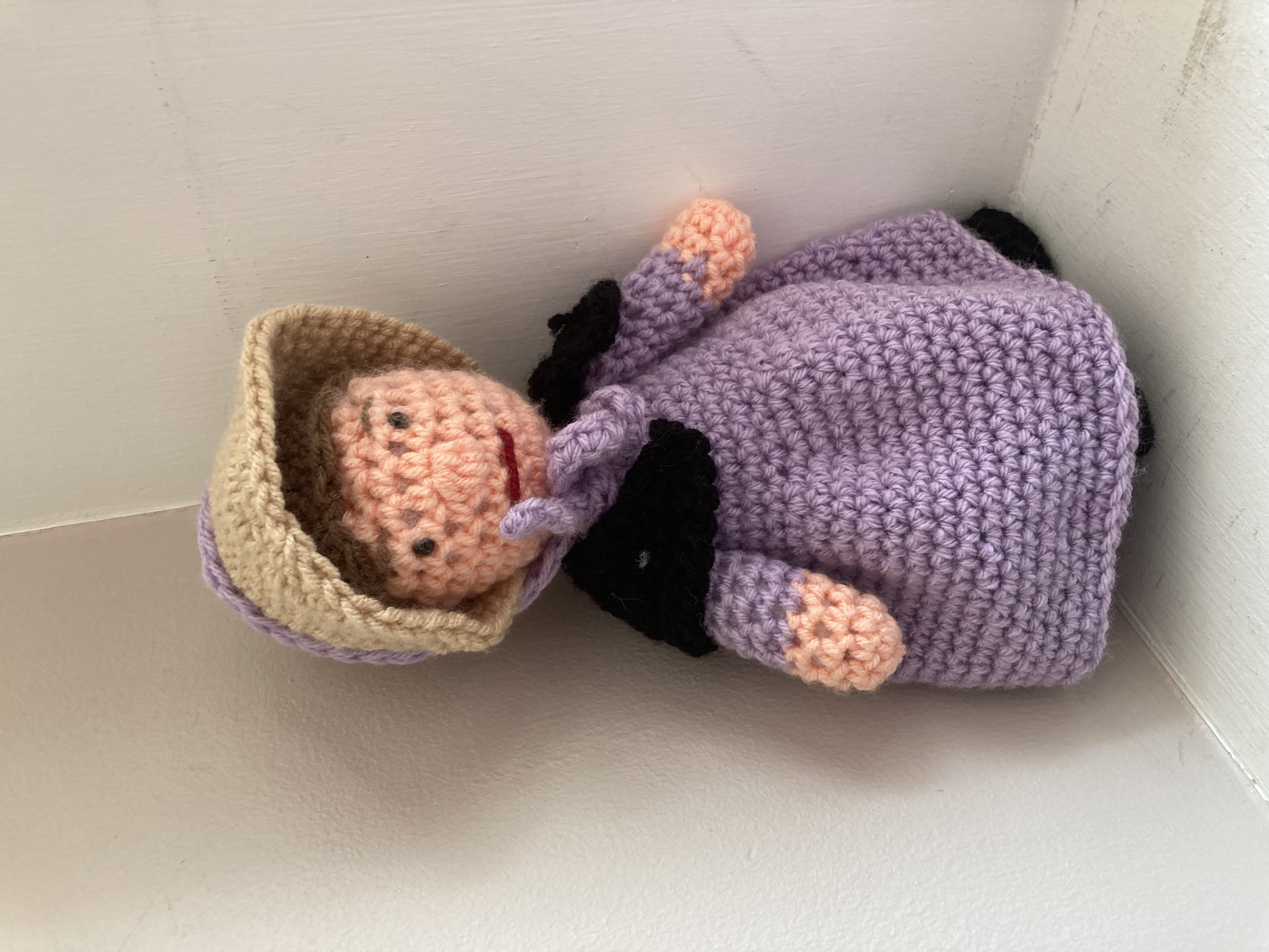 Charles Dickens’ titular heroine from his 1857 novel, Little Dorrit. She is made from acrylic yarn, polyfil stuffing and 6mm plastic eyes. Her bonnet and shawl are detached from her body and are choking hazards. This figure is not recommended for children 0-3 years old and should be kept out of reach.